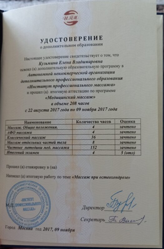 Специалист Елена Владимировна Киселева работает как массажист. Улучшить самочувствие можно разными способами, и массаж - один из наиболее приятных. При помощи различных техник, таких, как антицеллюлитный, восстановительный, корректирующий, масляный, общий, расслабляющий, спортивный, тонизирующий массаж, массаж стоп, спины, ног, головы, шейно-воротниковой зоны, специалист сможет привести в тонус уставшие мышцы или, наоборот, расслабить слишком напряженные участки тела. Елена Владимировна Киселева как профессиональный массажист поможет вам оставаться в форме. Воздействуя на активные зоны, она способствует стимулированию тока крови в организме, что плодотворно влияет на работу многих систем. На сеансе вам предоставится возможность не просто укрепить мышцы тела, но и зарядиться бодростью на весь день. Елена сделает все возможное, чтобы вы стали ее частым клиентом.